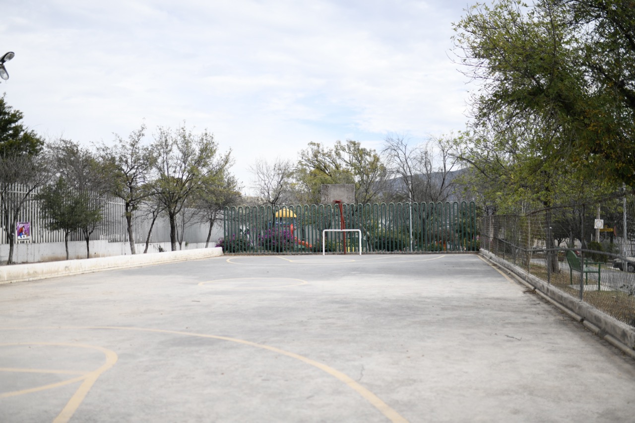 3. Colocar malla tipo de reja tauto verde alrededor de las 2 canchas de futbol/basquetbol, pasto sint茅tico en la de futbol, asi como piedra laja o pintura en bardas perimetrales y pintar la herreria.